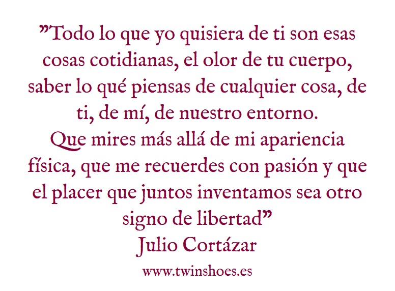 - «Todo lo que yo quisiera de ti son esas cosas cotidianas: el olor de tu cuerpo, saber lo que piensas de cualquier cosa, de ti, de mí, de nuestro entorno. Que mires más allá de mi apariencia física, que me recuerdes con pasión y que el placer que juntos inventamos sea otro signo de libertad» Julio Cortázar.